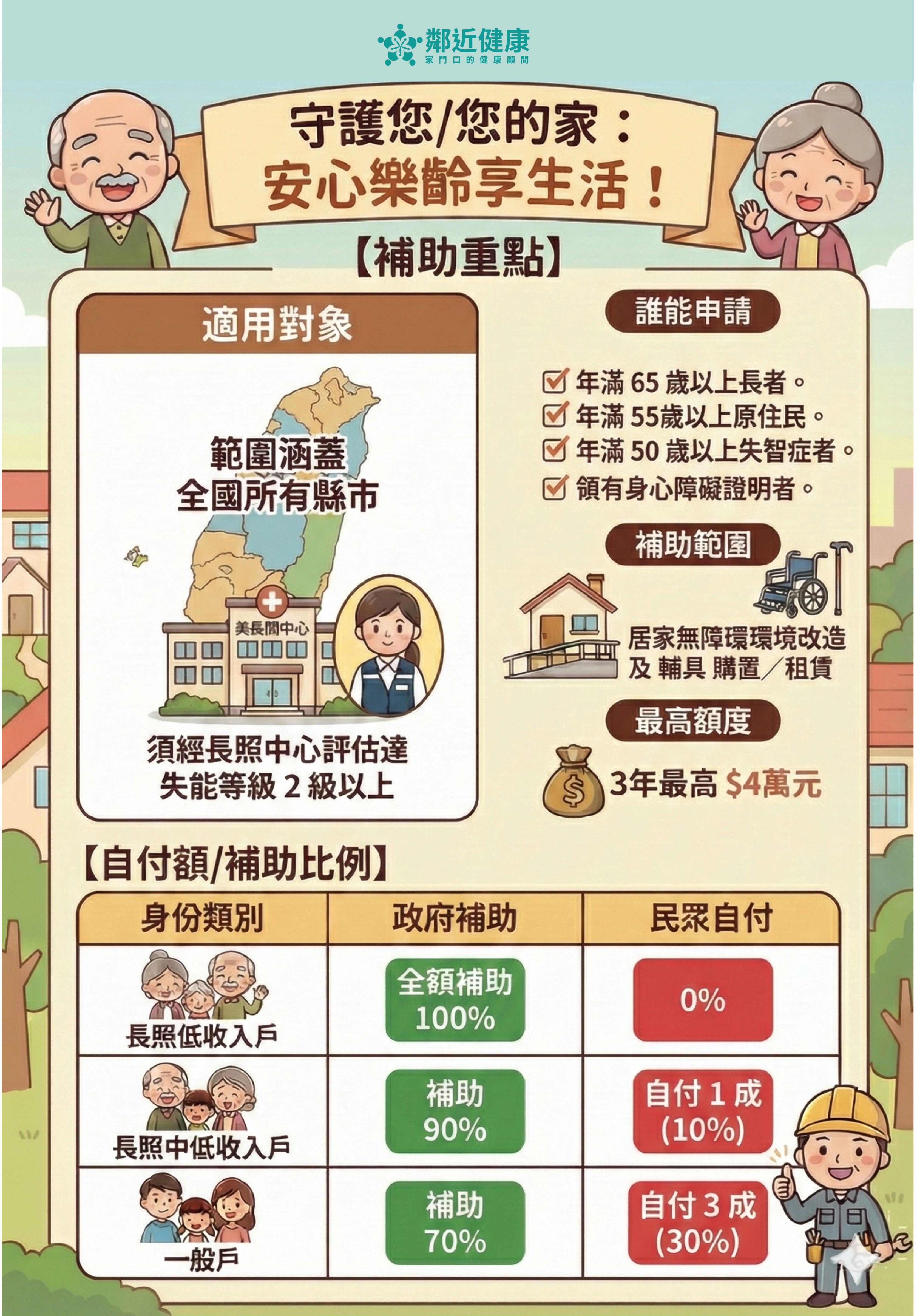⚠️ 補助申請說明與服務:各項工程建議與施作皆依循行政院衛生福利部及各地方政府之最新規範辦理。